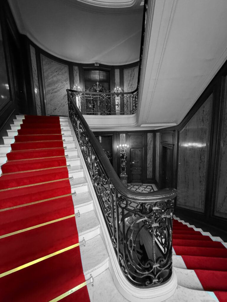 Voilà une photo qui montre un habillé descendant un escalier…
